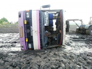 15 мая, приблизительно в 19:30, на автодороге между поселками Сарны и Попудня Монастирищенского района, во время урагана опрокинулся рейсовый автобус марки БАЗ.