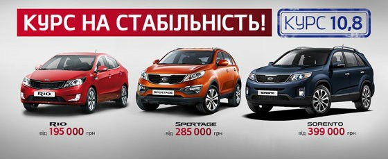 Только до 30 июня 2014 года бестселлеры модельного ряда - KIA Rio и KIA Sportage 2014 года, а также KIA Sorento 2013 года можно приобрести по специальным, зафиксированными ценами, по коммерческому курсу 10 ,8 гривны за 1 доллар США*.