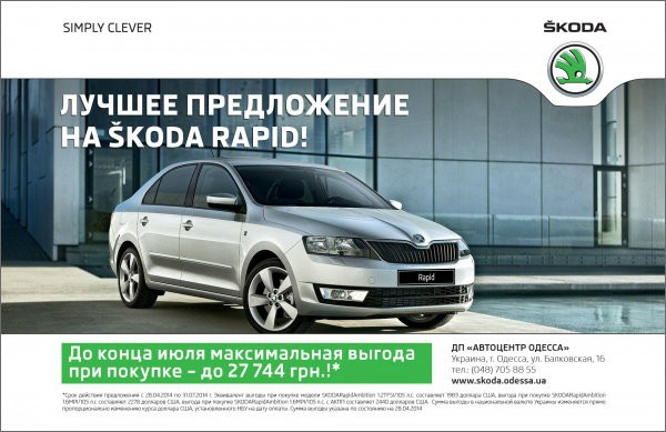 АВТОЦЕНТР ОДЕССА продолжая политику направленности на интересы клиентов, подготовила самое выгодное ценовое предложение на автомобили SKODA Rapid. Новое предложение действует на автомобили SKODA Rapid в комплектации Ambition для двигателей 1.2TSI, 1.6MPI мощностью 105 л.с.