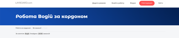 - Layboard.com. Цей сайт пропонує актуальні вакансії для водіїв у різних країнах. Наприклад, Анатолій пише: “Шукав роботу водієм в Європі. Знайшов Лейборд та у всьому швидко розібрався, вже працюю, тому рекомендую”.