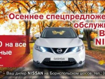 Специально для всех владельцев автомобилей Nissan мы разработали предложение, призванное помочь поддерживать автомобиль в отличной форме и рабочем состоянии – в период с 1 сентября по 30 ноября мы предоставляем ВСЕМ клиентам на ВСЕ работы* скидку в 40%