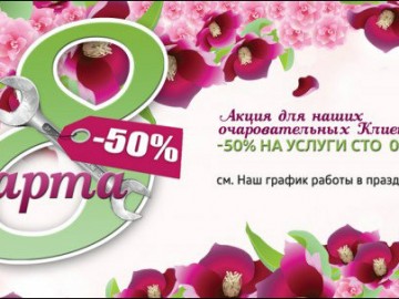 Если Вы из их числа, то приглашаем Вас к нам на СТО с 5 по 11 марта 2016 года. В этот период для милых дам, которые являются владелицами авто или лично приедут к нам на сервисное обслуживание или ремонт автомобиля (т.е. являются пользователем авто, но не владелицей по техпаспорту), будет действовать праздничная скидка 50% на услуги СТО.