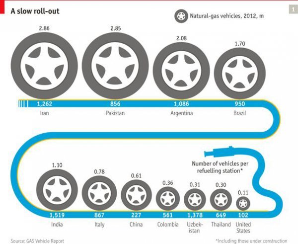 Если составить рейтинг стран по количеству автомобилей на газе, то США в ТОП-10 не входят. Лидером является Иран – местные производители массово штампуют машины с двигателями, уже адаптированными к работе на CNG*. Некоторые возят в Украину.