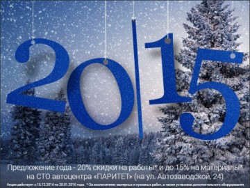Предложение года - 20% скидки на работы* и до 15% на материалы*, именно столько экономят владельцы автомобилей HYUNDAI при прохождении технического обслуживания на СТО автоцентра «ПАРИТЕТ», в период новогодних и рождественских праздников! Акция действует с 15.12.2014 по 20.01.2015 года.