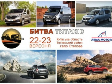 АРМА МОТОРС – лідер з продажів автомобілів Renault цього року буде на «Битві Титанів-2016» і знайомитиме Вас з автомобілями комерційної лінійки Renault – MASTER, TRAFIC та DOKKER VAN, а також з уже відомим Renault DUSTER та новинкою KADJAR.