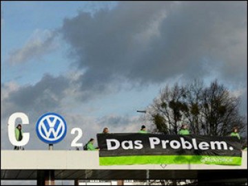 Члены Greenpeace в ходе акции требовали от концерна раскрытия реальных данных о выбросах углекислого газа автомобилями с дизельным двигателем.