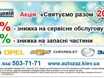 СУЩНОСТЬ: Каждому Клиенту владельцу автомобиля брендов OPEL, Chevrolet, ZAZ, Daewoo, обсуживающихся на ООО «Автоцентр на Кольцевой» в период проведения акции, предоставляется возможность получить скидку 20% на услуги и 15% на запасные части *.