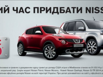 * Цены на все модели Nissan зафиксированы в гривнах с учетом курса гривны к доллару США согласно межбанка по состоянию на 01.03.14 г. В течение срока действия акции цены остаются без изменений на весь модельный ряд Nissan (кроме моделей Murano, Patrol, New Qashqai и GT-R).