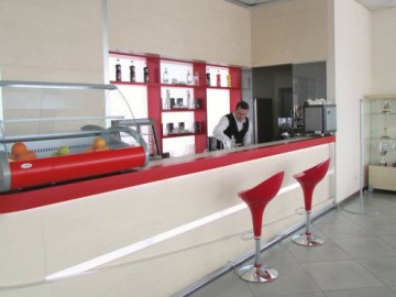 В кафе царит уютная неформальная атмосфера. Здесь можно с удовольствием скоротать время, ожидая сервисное обслуживание автомобиля, оформление документов и т.д. Вам будет предложен широкий ассортимент горячих и прохладительных напитков. Тут можно быстро перекусить аппетитными сэндвичами, воздушными булочками и круассанами. Интерьер кафе выполнен в современном стиле.