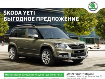 В официальной дилерском центре АВТОЦЕНТР ОДЕССА действует специальное предложение. Только до 30 ноября 2014 года автомобили SKODA Yeti предлагаются на эксклюзивных условиях, выгоднее на 31 047 грн!.
