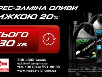 Тільки з 15.10.2015 р.до 30.11.2015 р. дилерський центр Mazda «ВіДі-Скай» пропонує скористатися послугою експрес — заміни оливи за 30 хв. зі знижкою до 20%*.
