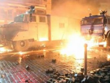 Ночью во время штурма Евромайдана активисты сожгли водомет и БТР, которым пытались протаранить баррикады.