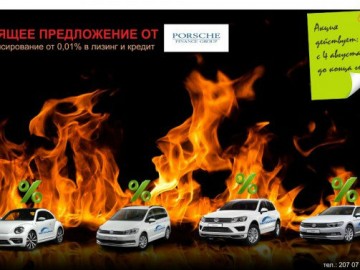 Porsche Finance Group с 4 июля и до конца 2016 года предлагает акционное финансирования от 0,01% в лизинг и кредит на новые автомобили VW Touareg, Passat, Touran и Beetle.