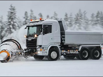 Секрет норвежской уборки в использовании мощной коммунальной техники. Как только начинает идти снег, на дорогу тут же выезжают снегоуборщики с причудливыми отвалами. Как правило, они оснащены мощнейшими моторами. Нам довелось поездить на Scania R580 6x4, на который навешен спереди снегоочистительный отвал фирмы Veraasen. Он может перемещаться в трех плоскостях с помощью джойстика в кабине. Короткий инструктаж и тренировка на месте и отправляемся чистить взлетную полосу аэродрома городка Trysel.
