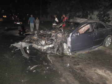 «Иномарка на большой скорости (как минимум 120 км/час. — Авт.) двигалась в сторону Броварского проспекта. Но на повороте, возле пешеходного мостика, водитель потерял управление, ударился в отбойник, после чего 70—80 метров проехал на боку и «затормозил» об электроопору. После удара машина начала гореть.