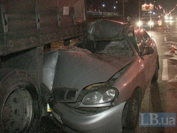 По рассказам очевидцев, Daewoo двигался в средней полосе в направлении выезда из Киева. По непонятной причине, автомобиль начал перестраиваться вправо и на полной скорости врезался в припаркованный в правой полосе грузовик.