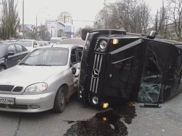 По словам очевидцев, черный Mercedes G500 мчался на приличной скорости в направлении Соломенской площади. В какой-то момент водитель внедорожника не справился с управлением и зацепил Hyundai Sonata, который от удара вынесло на встречную полосу. А немецкий внедорожник продолжив полет, был остановлен Daewoo Lanos – ударив который, Mercedes G-класса "сдался", опрокинувшись на левый бок. Причем при "падении", черная иномарка зацепила проезжавший рядом Volkswagen Golf.