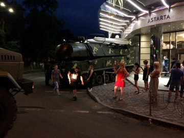 На улице Ярославской в Киеве зенитная установка «Бук», которая предположительно участвовала в репетиции военного парада ко Дню независимости, врезалась в здание бизнес-центра.