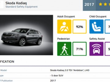 Проверку безопасности новый вседорожник проходил в комплектации Ambition. По данным Euro NCAP, кроссовер Skoda Kodiaq обеспечивает защиту на уровне 92% для водителя и взрослого пассажира. Безопасность пассажира-ребенка оценили в 77%, пешеходов — 71%, а набор устройств обеспечения безопасности получил рейтинг в 54%, сообщает .