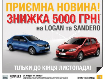 *Период проведения акции: с 1.11.2013 по 30.11.2013 года. Указанные цены действительны до 30.11.2013 г. Под выгодой 5 000 грн подразумевается скидка в 5 000 грн. от розничной стоимости автомобилей Renault Logan и Renault Sandero (включая Stepway). Розничная стоимость Renault Logan от 114 800 грн., Renault Sandero 118 800 грн.Скидка не распространяется на автомобили Renault Logan MCV.