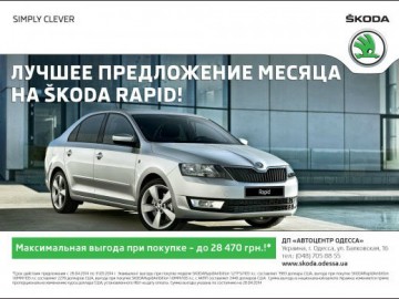 АВТОЦЕНТР ОДЕССА продолжая политику направленности на интересы клиентов, подготовила самое выгодное ценовое предложение на автомобили SKODA Rapid. Новое предложение действует на автомобили SKODA Rapid в комплектации Ambition для двигателей 1.2TFSI, 1.6MPI, 1.6MPI АКПП, мощностью 105 л.с.