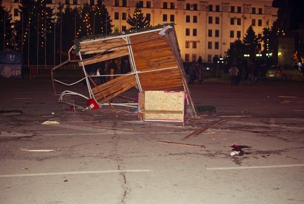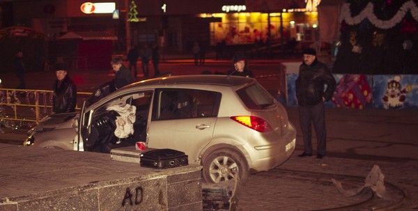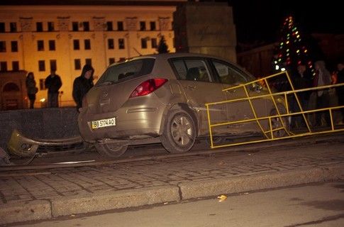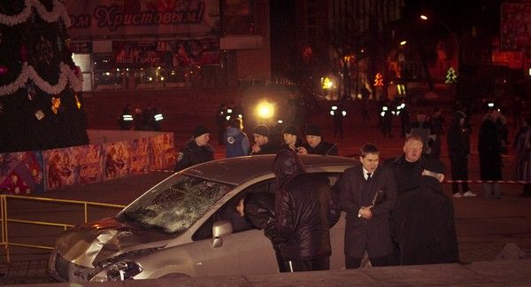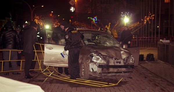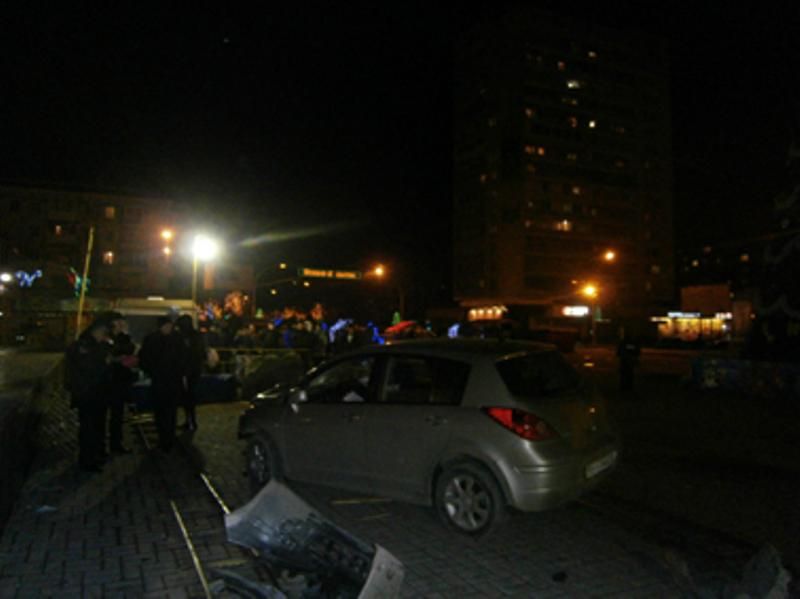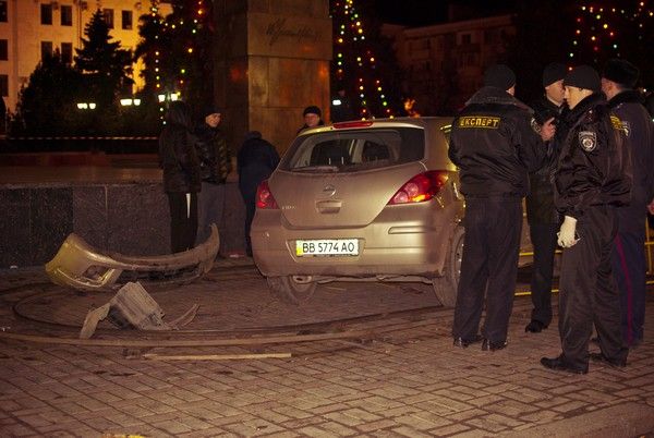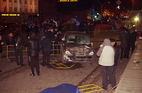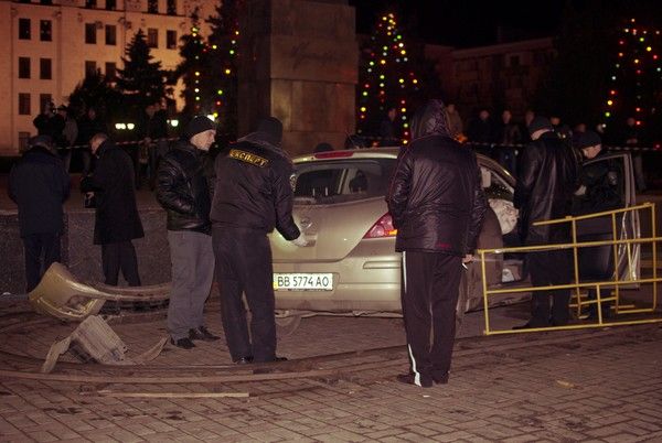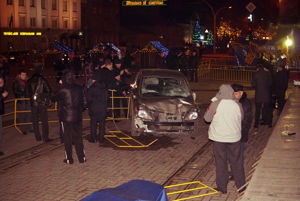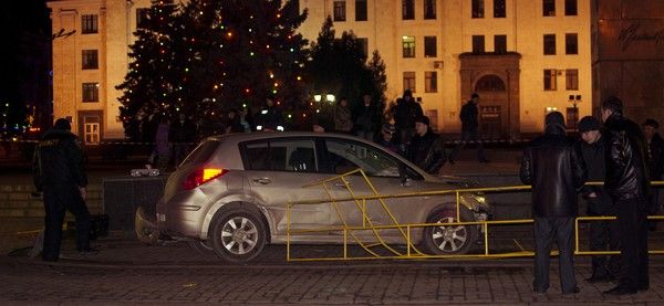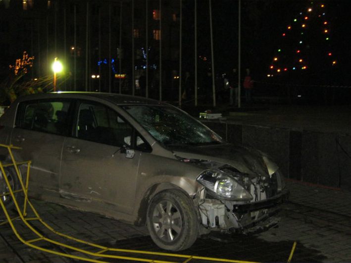 Автомобиль NISSAN TIIDA (госномер ВВ 5774 АО), под управлением водителя 1982 года рождения, жителя города Луганска, не работающего, двигаясь по улице Коцюбинского в направлении Театральной площади, несмотря на установленные дорожные знаки „Въезд запрещен“ и „Объезд препятствия справа“, совершил столкновение с переносным металлическим ограждением площади, снес киоск, продолжая движение, совершил наезд на группу людей, отдыхавших у новогодней елки», — говорится в сообщении пресс-службы милиции.