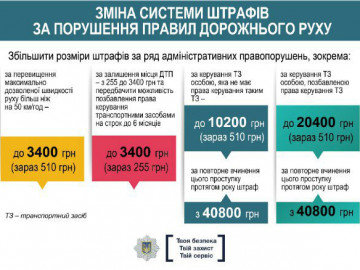 Так, штраф за превышение скорости более чем на 50 км предлагают повысить с 510 до 3400 гривен, за сокрытие с места совершения ДТП - с 255 до 3400 с возможностью лишения права управлять транспортным средством на 6 месяцев, за управление транспортным средством без права управления - с 510 до 10200 гривен, за управление транспортным средством лицом, лишенным такого права, - с 510 до 20400 гривен.