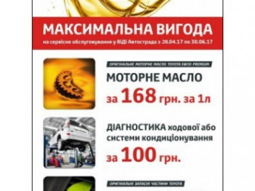 Только с 20 апреля по 30 июня 2017 всем клиентам Тойота Центр Киев ВиДи Автострада предоставляется возможность максимально выгодно воспользоваться услугами официального сервиса Тойота!.
