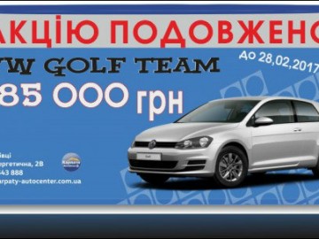 Тільки для Вас акцію продовжено до 28.02.2017р. для можливості придбати спеціальну модель Golf Team 1.4 TSI DSG7 по ціні в 685 000 грн., та отримати вигоду для себе 73 638 грн.!