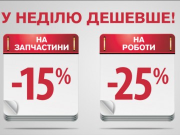 Мы стараемся быть не только полезными, но и выгодными! Вспоминая улыбки на лицах наших клиентов, при посещении СТО в период «Акции выходного дня», мы решили продлить эту акцию до 30 мая. Каждое воскресенье на СТО «АвтоАльянс Киев» скидки -15% на запасные части и -25% на работы.