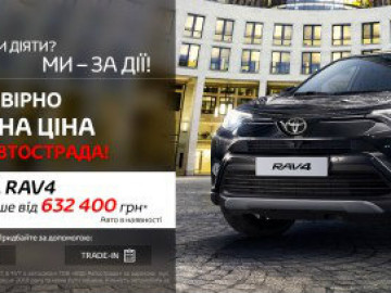* Зазначена спеціальна ціна діє на автомобіль Toyota RAV4 2.0 Dual VVT-i 2WD, COMFORT, 6 M/T в період з 7 по 20 вересня 2018 року в автосалоні ТОВ «ВіДі Автострада» за адресою: вул. Велика Кільцева, 56, с. Софіївська Борщагівка, Київська обл. Кількість автомобілів обмежена. Щоб отримати довідку про наявність автомобілів із зазначеними умовами звертайтеся до консультантів з продажу ТОВ «ВіДі Автострада» за телефоном: (044) 50-333-50 (вартість дзвінків відповідно до тарифів вашого оператора зв’язку).
