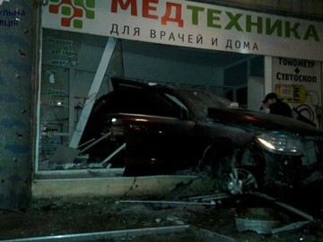 "Вероятно, увидев проблесковые маячки, водитель Mercedes прибавил скорость. В течение минуты, не справившись с управлением, по ступенькам автомобиль влетел в магазин", – сказано в сообщении.