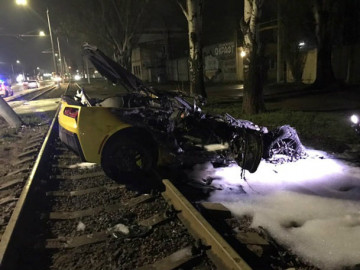По его словам, водитель спорткара не справился с управлением и въехал в осветительный столб. От удара машину выбросило на рельсы, где она загорелась.