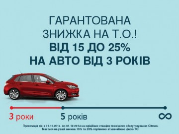Осень – пора опадания листьев, а для сервиса Citroёn – падения цен! Этой осенью авторизованные сервисные центры Citroёn предлагают проведение фирменного ТО по фиксированной стоимости, единой для всех дилеров одного региона. А для негарантийных автомобилей на ТО установлены специальные цены, с выгодой до 25% от стандартной цены. И чем старше автомобиль – тем привлекательнее итоговая цена: 15% выгоды для автомобилей возрастом от 3-х до 5-и лет и 25% выгоды для автомобилей возрастом 5 лет и более.