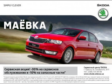 Каждый владелец автомобиля Skoda, при проведении работ по ТО, ТР на СЦ ДП «АВТОЦЕНТР ОДЕССА» в период с 5 по 8 мая 2014 года, получает скидку в размере 30% на услуги сервиса и 10% на запасные части.