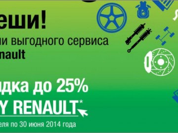 * Скидка до 25% на запасные части, необходимые для проведения периодического технического осмотра, предоставляется при условии регистрации в разделе My Renault на сайте renault.ua Клиентам, которые не зарегистрировались в разделе My Renault, предоставляется скидка до 20%. Предложение действует с 23.04.2014 по 30.06.2014 года.