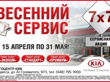 Специально для Вашего удобства, АВТОЦЕНТР КИА объявляет о запуске ежегодной сервисной акции "ВЕСЕННИЙ СЕРВИС 7х7". Каждый владелец автомобиля KIA, в период с 15 апреля по 31 мая 2014 года получает возможность воспользоваться сервисными услугами по акционным ценам* по одному из трех пакетов.