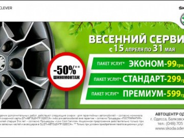 Каждый владелец автомобиля SKODA, в период с 15 апреля по 31 мая 2015 года получает возможность воспользоваться сервисными услугами по акционным ценам* по одному из трех пакетов и провести шиномонтаж со скидкой 50%**!