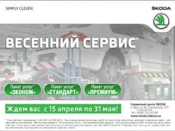 Специально для Вашего удобства, сервисный центр SKODA ДП "АВТОЦЕНТР ОДЕССА" объявляет о запуске сервисной акции "ВЕСЕННИЙ СЕРВИС". Каждый владелец автомобиля SKODA, в период с 15 апреля по 31 мая 2014 года получает возможность воспользоваться сервисными услугами по акционным ценам* по одному из трех пакетов.