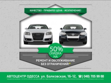 Сервисный центр АВТОЦЕНТР ОДЕССА предоставляет специальную программу обслуживания автомобилей VOLKSWAGEN, AUDI: скидка на ремонт и обслуживание -50% БЕЗ ОГРАНИЧЕНИЙ!*