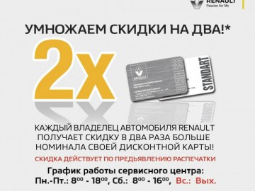 Только в период с 11 января по 29 февраля 2015 года, каждый владелец автомобиля RENAULT, посетив официальный сервисный центр АВТО ГРУП+ и предъявив дисконтную карту любого официального дилера, в т.ч. СЦ АВТО ГРУП+, получает удвоенную скидку на сервисное обслуживание своего автомобиля*!