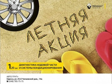Специально для владельцев автомобилей RENAULT, до 31 августа 2015 года, действует комплексное акционное предложение «ЛЕТНЯЯ АКЦИЯ»: диагностика ходовой части и системы кондиционирования предлагается по специальной фиксированной цене - за 1,20 грн*!