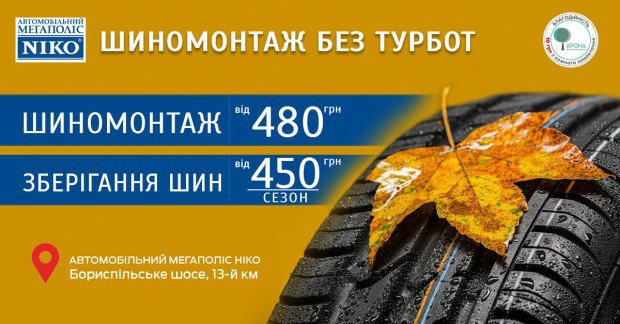 Этой осенью, воспользуйтесь специальным предложением - шиномонтаж без забот от 480 грн в дилерских центрах «Автомобильного Мегаполиса НИКО». Новейшее оборудование, профессиональные специалисты и гарантия на все проведенные работы позволят с уверенностью управлять автомобилем в любую погоду.