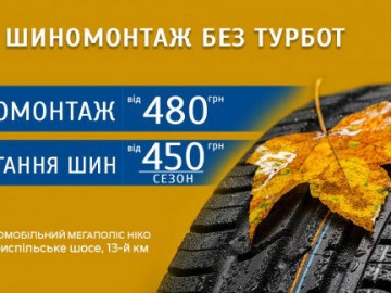 Этой осенью, воспользуйтесь специальным предложением - шиномонтаж без забот от 480 грн в дилерских центрах «Автомобильного Мегаполиса НИКО». Новейшее оборудование, профессиональные специалисты и гарантия на все проведенные работы позволят с уверенностью управлять автомобилем в любую погоду.