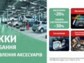 * Скидка действует только на ограниченный ассортимент аксессуаров и работы по их установке и не распространяется на другие услуги и материалы, а также не суммируется с другими скидками, в частности по Программе Лояльности. Работы по установке аксессуаров по акционной цене проводятся только при условии их покупки в ООО «ВиДи Автострада». Акция действует с 15 марта 2016 по 31 мая 2016 года в ООО «ВиДи Автострада» по адресу: ул. Большая Окружная, 56, с. Софиевская Борщаговка, Киевская обл., Украина. Для получения более подробной информации об условиях акции обращайтесь к консультантам отдела сервиса по телефону (044) 50-333-05 (стоимость звонков согласно тарифам операторов связи).