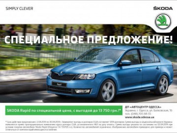Со 2 апреля 2014 года в АВТОЦЕНТРЕ ОДЕССА действует специальное предложение на автомобили SKODA Rapid! Только сейчас SKODA Rapid доступен по специальной цене, с выгодой до 13 750 грн.!* Специальные цены действуют до 30 апреля 2014 г.