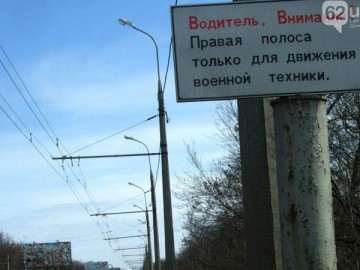 На основных дорогах Донецка и Макеевки появился указатели с надписью "Водитель, Внимание! Правая полоса только для движения военной техники".