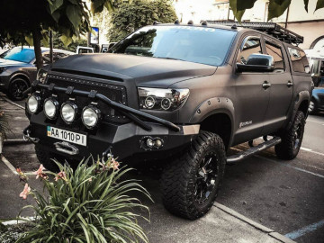 Пикап Тойота Тундра получил внедорожные шины, лебедку и стальные бамперы. Появились кунг с отдельной дверью и дополнительная диодная оптика, а дорожный просвет увеличен. Шноркель позволяет преодолевать броды.