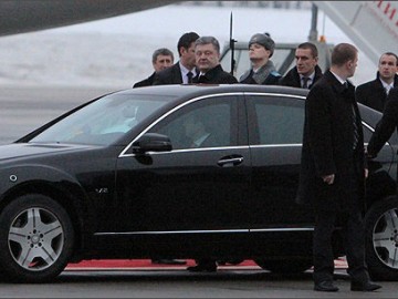 Следом прилетел Петр Порошенко - к трапу его самолета подогнали черный Mercedes S500 с украинскими номерами. В его кортеж также входили автомобили посольства и машины "совминовской" охраны.