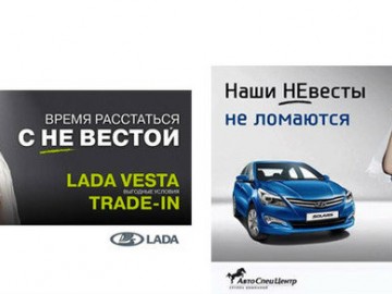 Рекламная картинка Lada Vesta намекает, что пора избавляться от старых машин и пересаживаться на изделия Lada. Главными конкурентами «Весты» являются Kia Rio и Hyundai Solaris. Сегодня в Москве появились билборды Hyundai c надписью «Наши НЕвесты не ломаются». Интересно, чем ответит Lada?